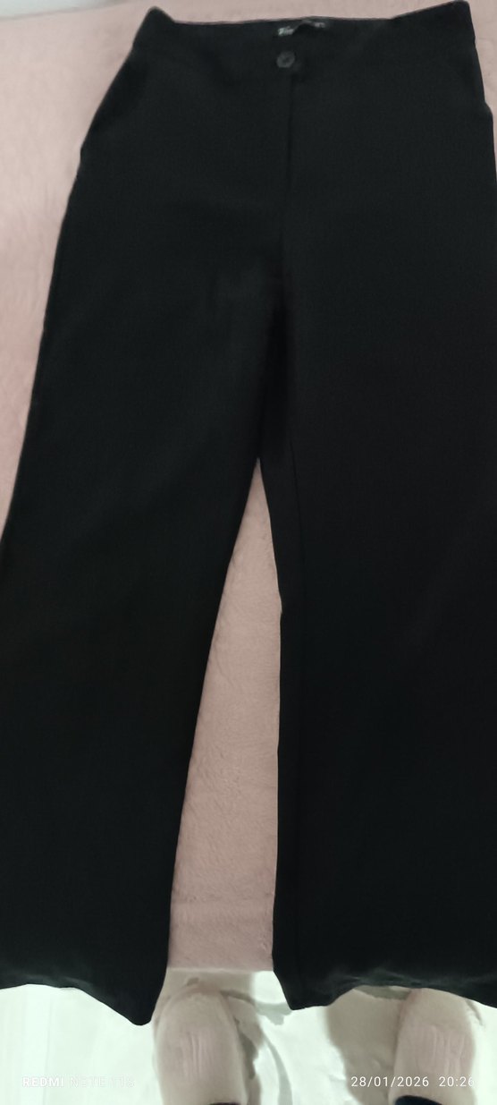 Satenimsi siyah kumaştan, midi boy ve normal kesim,kadın pantolon. Ofis için minimalist ve normcore tarzında. İspanya paça çok az kullanılmış hiç bir sorunu yoktur yumuşak ve rahattır