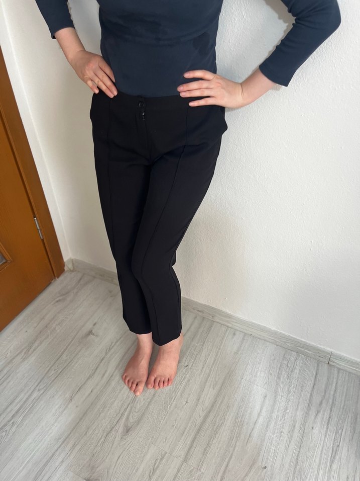 Düz siyah, midi boy, regular fit kadın kumaş pantolon. Yumuşak sentetik kumaştan, rahat ve şık bir görünüm sağlar.