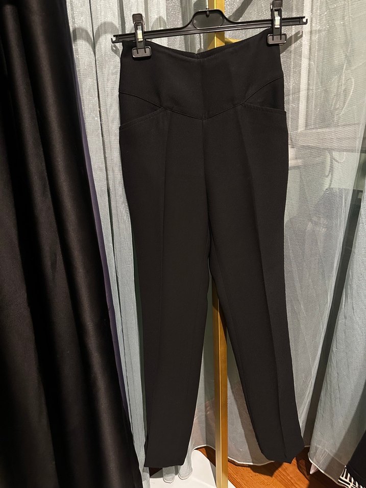 Siyah midi boy, regular fit kadın pantolon, yırtmaç detaylı ve sentetik kumaştan. Ofis için çağdaş tarzda uygun.