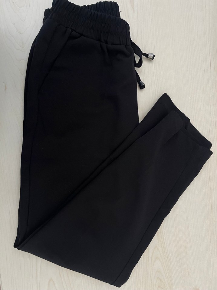 Siyah midi uzunlukta kadın kumaş pantolon, düzenli kesim ve bağcıklı lastikli bel ile. Yumuşak sentetik kumaştan, gündelik şıklık için uygundur.