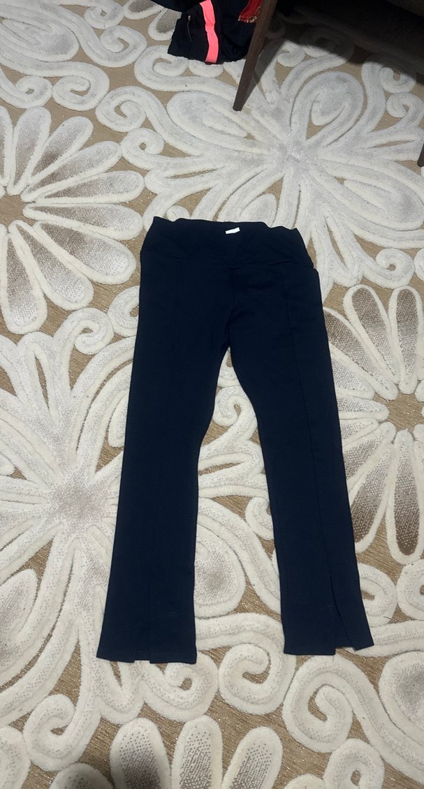 Siyah, midi boy, sentetik kumaştan kadın pantolonu. Normal kesim, günlük sokak stili ve athleisure için uygun. Rahat ve şık görünüm sağlar.