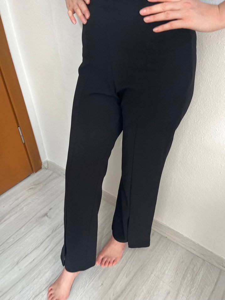 Siyah midi boy, regular kesim kadın pantolon. İpeksi kumaştan, desensiz ve ofis ile günlük kullanıma uygun şık bir model.