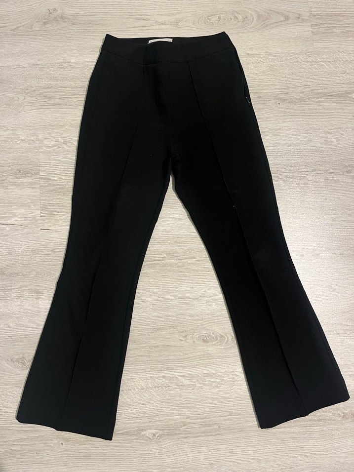 Düz siyah, midi boy kadın kumaş pantolon. Rahat kesim ve yumuşak sentetik kumaştan üretilmiştir. Ofis için sade ve şık bir tercih.