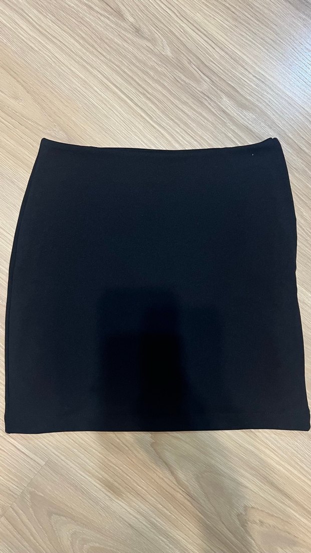 Siyah, düz ve midi uzunlukta, sentetik kumaştan yapılmış, ofis için uygun, sade ve şık mini kadın eteği.