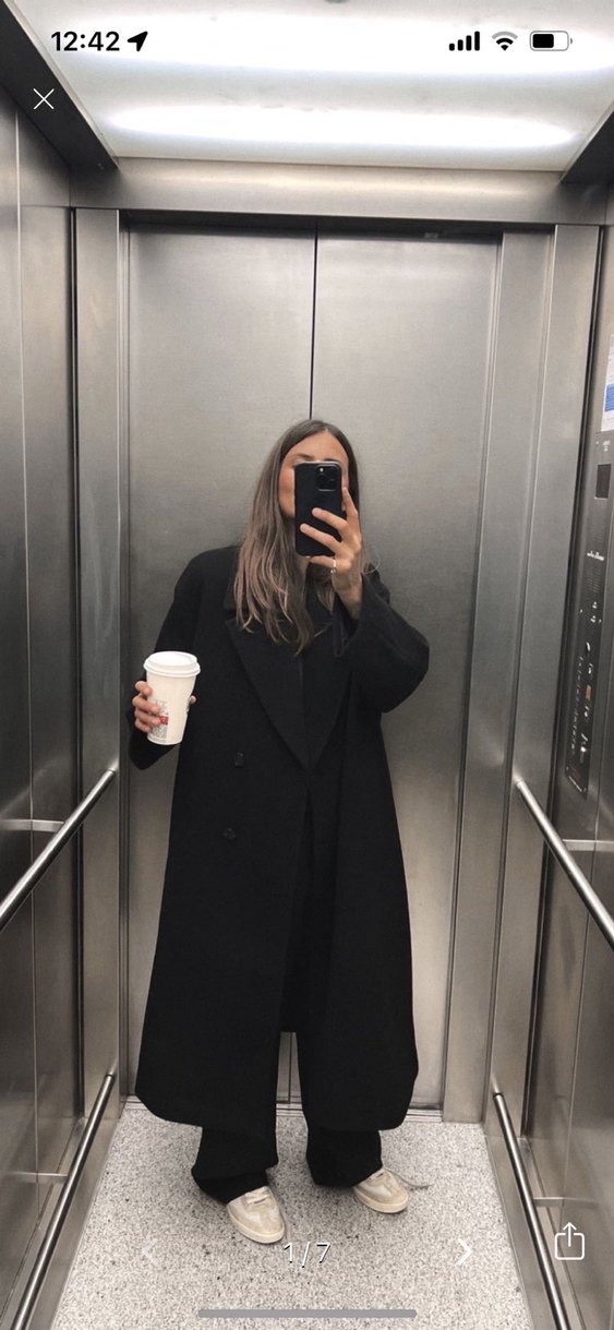 Yumuşak ve sıcak kumaştan, uzun kollu, notalı yakalı siyah midi oversize kaban. Günlük kullanıma uygun rahat ve şık tasarım.