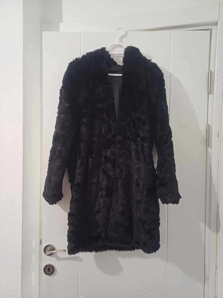 Siyah midi uzunlukta kadın peluş kürk kaban, kürk detaylı ve kesik yaka. Uzun kollu, bol kesim ve yumuşak, sıcak kumaştan yapılmıştır. Romantik akşamlar için uygun.