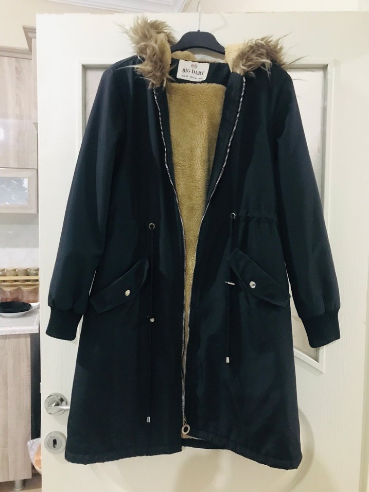 Siyah midi boy kadın ceketi, bol kesim, kürklü kapüşon ve uzun kolludur. Peluş astar içerir, günlük kullanıma uygundur. Önden cepli ve fermuarlıdır. Kabanda 36 38 arası olur