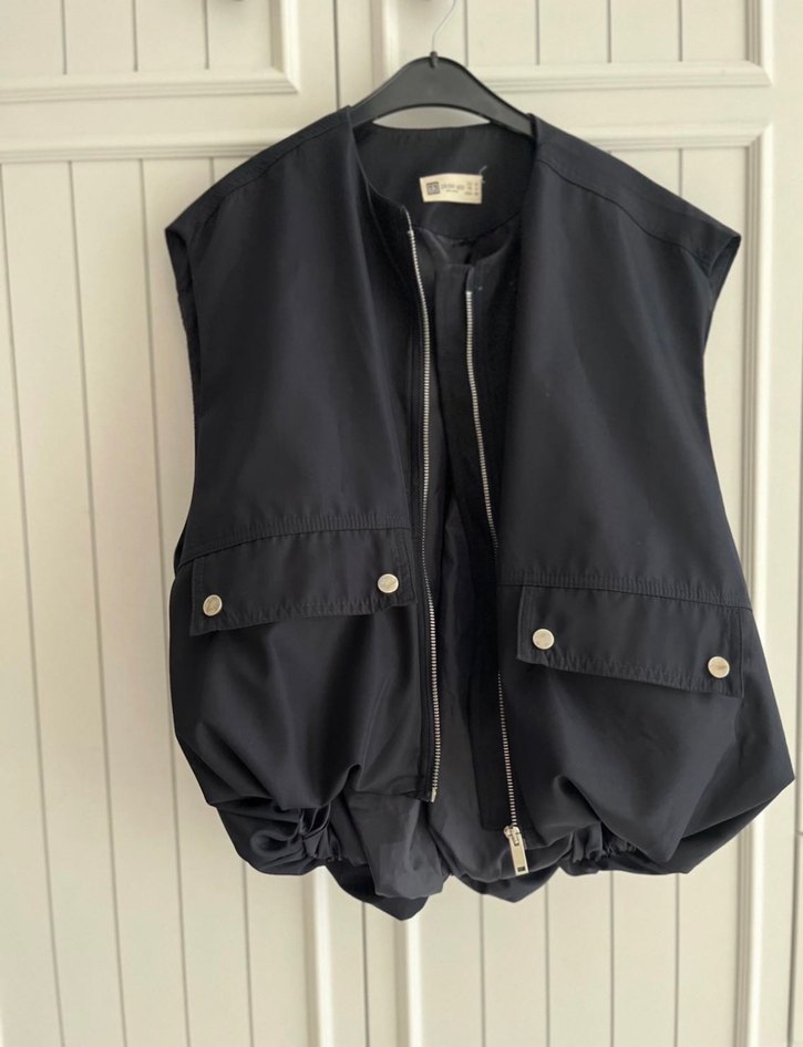 Siyah kemerli, kolsuz, midi uzunlukta, bol kesim kadın yelek. Ön cepleri ve düğme detayları bulunur, günlük sokak stili için uygundur.