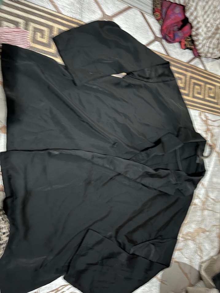 Siyah, midi boy, salaş kesim, uzun kollu kadın elbisesi. Minimalist tarzda, desensiz ve rahat bir model. 5 xl saten ceket