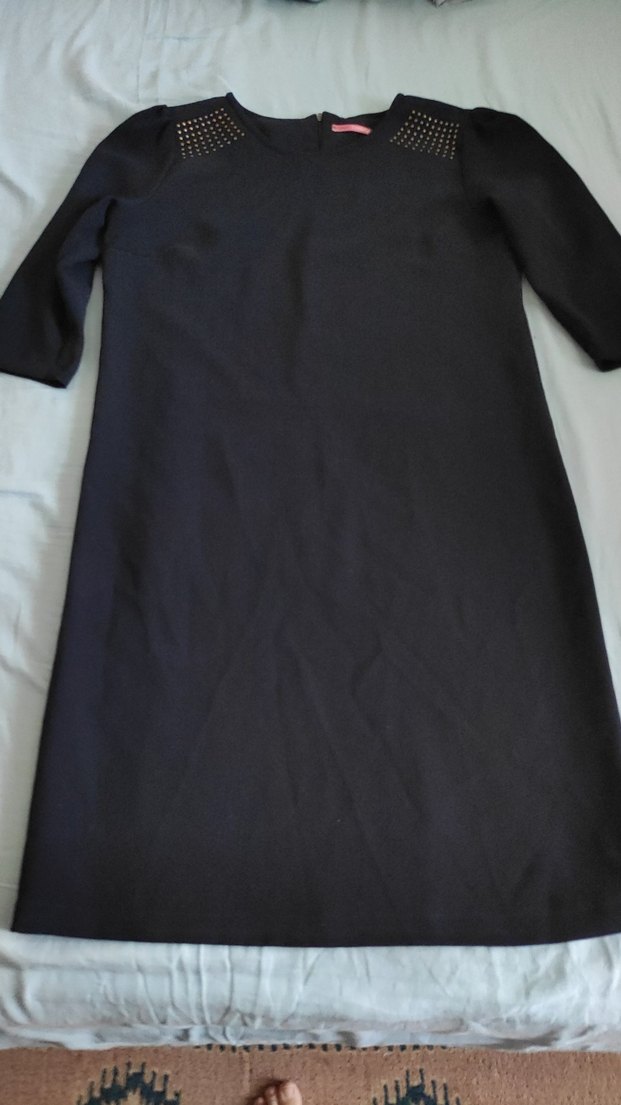 Deri görünümlü siyah midi elbise, yuvarlak yaka ve fakir kolludur. Omuzlarda küçük zımba detaylarıyla ofis için sade ve şık bir tercih.