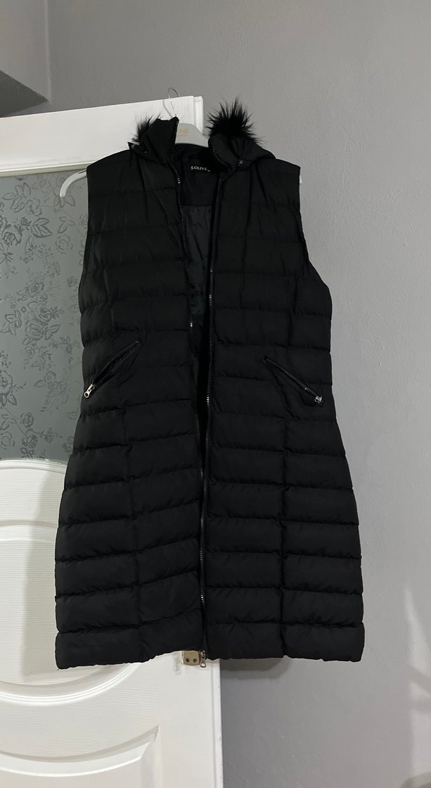 Siyah midi uzunlukta, yüksek yakalı, fermuarlı ve cepli kadın şişme yelek. Rahat ve şık sokak stili için yumuşak sentetik kumaştan, kolsuz ve vücuda oturan kesim.