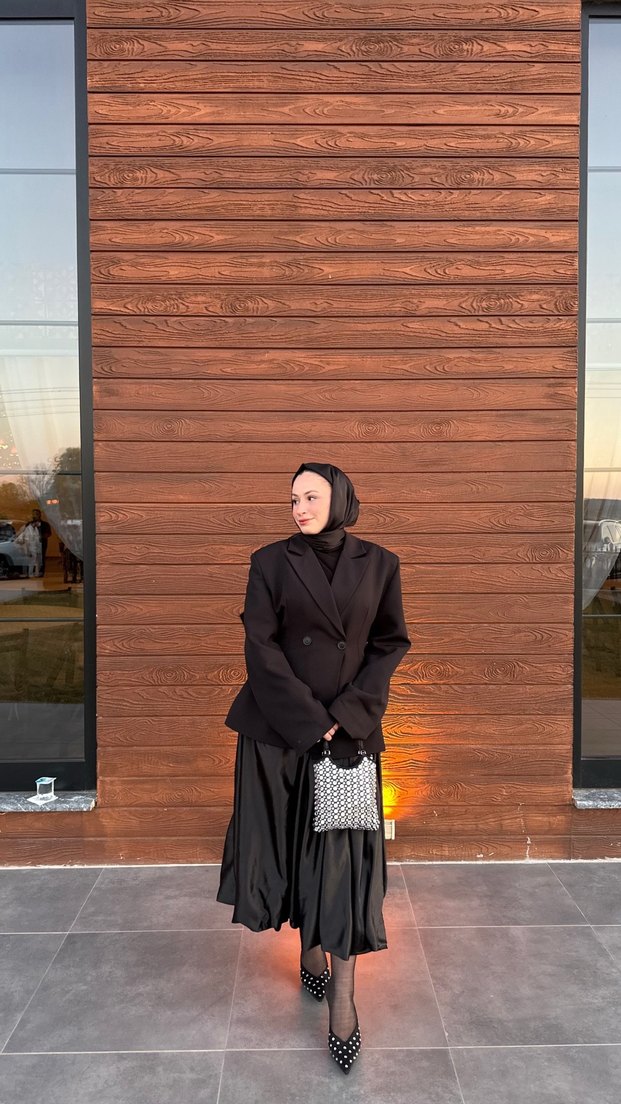 Siyah kadın takımı, notlu yaka ve uzun kollu, sentetik kumaştan üretilmiştir. Normal kesim ve midi boy etekle günlük kullanıma uygun, sade ve şık bir tarza sahiptir. Blazer ceket ve etek kendim kombinledim bir kere giyildi