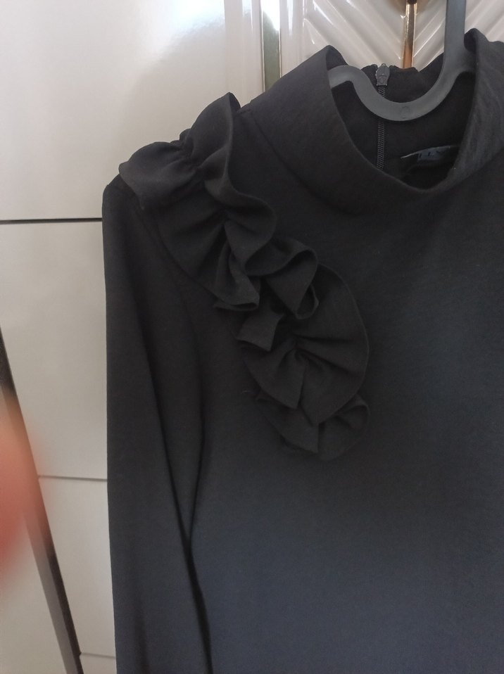 Siyah midi uzunlukta, bol kesim, yüksek yakalı ve uzun kollu kadın takımı. İpeksi kumaştan, günlük sokak stiline uygun rahat ve şık bir tasarım.
