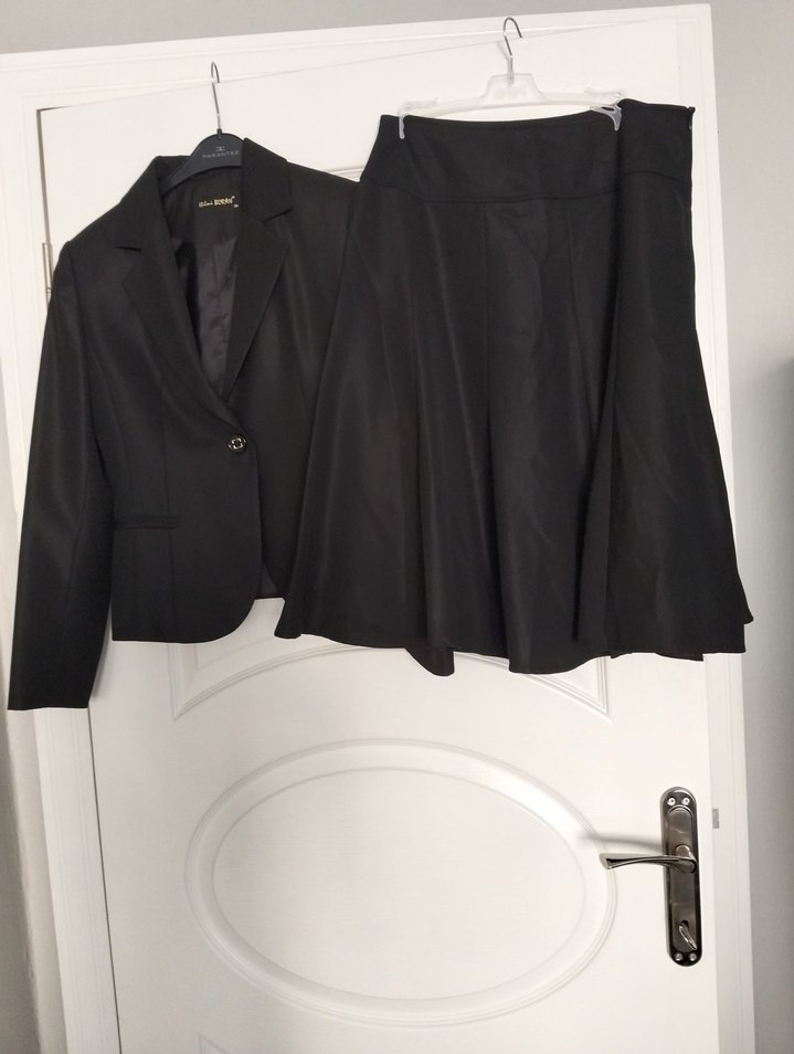 Kadınlar için regular fit, uzun kollu ceket ve pileli midi etekten oluşan siyah takım elbise. Ofis ve iş ortamları için uygun, satenimsi dokuda klasik goth tarzı.