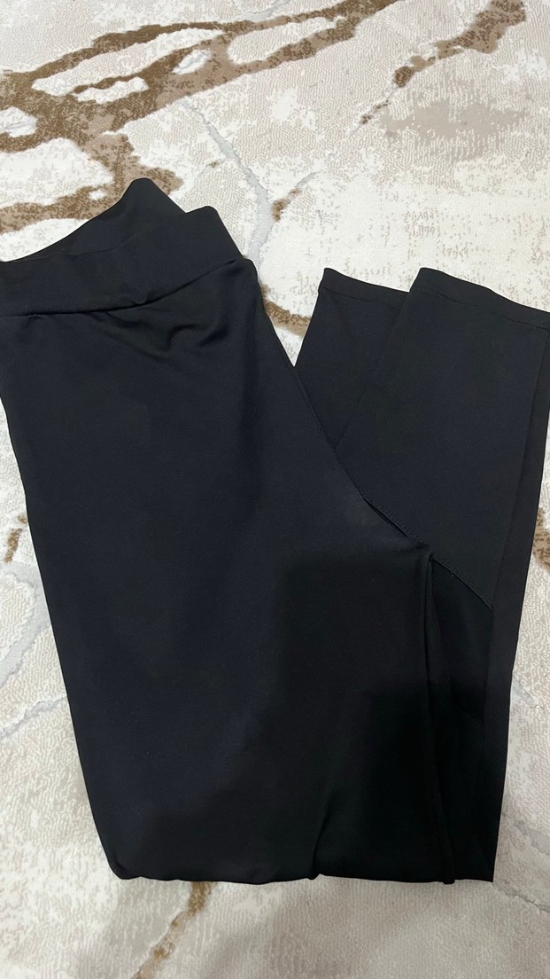 Siyah midi tayt, vücuda oturan kesim ve düz sentetik kumaş ile günlük sokak stili için rahat ve şık bir tercih.