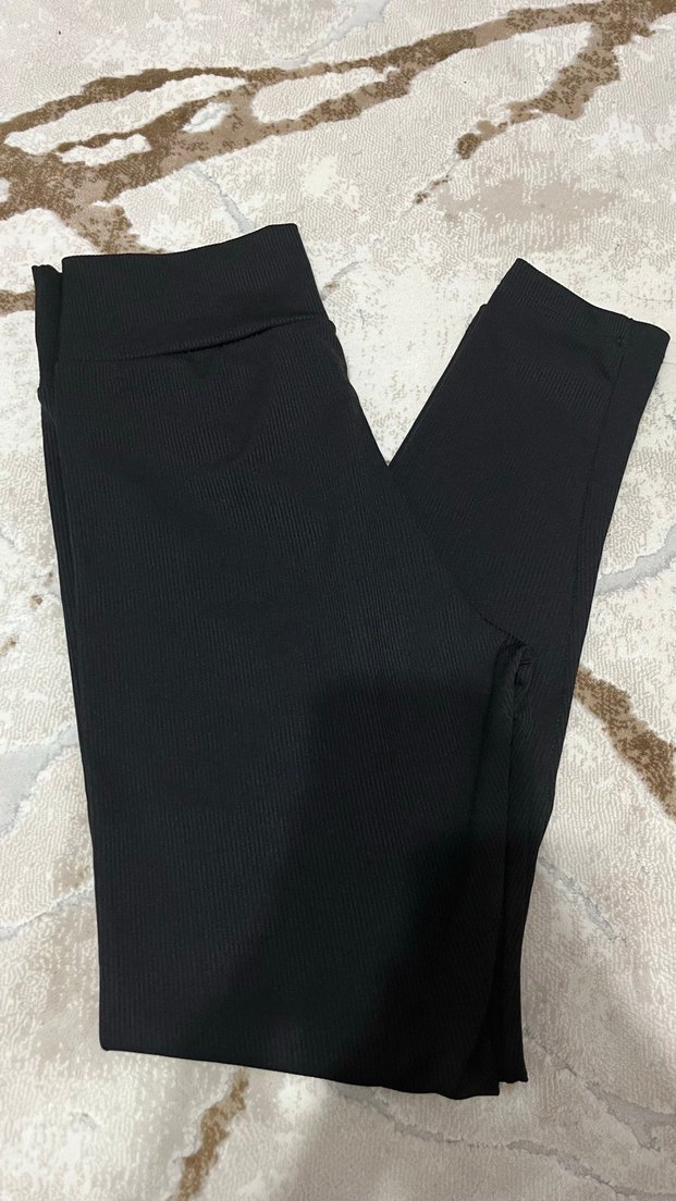 Siyah midi uzunlukta, elastik bel bantlı, sentetik kumaştan üretilmiş, günlük kullanıma uygun, dar kesim kadın tayt.
