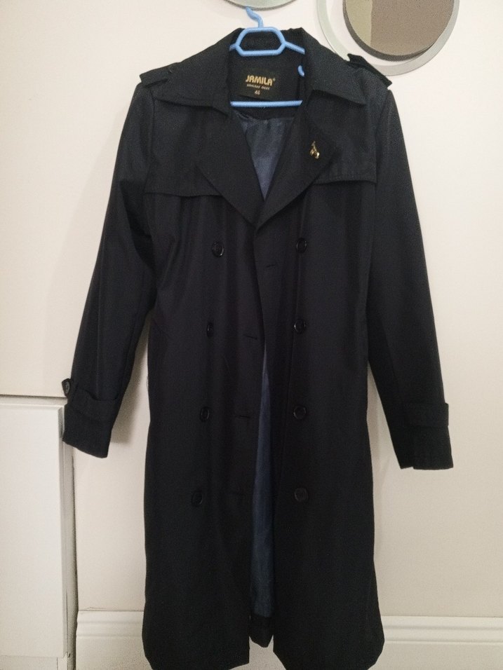 lacivert midi trençkot, yaka detaylı ve uzun kolludur. Düğmeli, regular fit ve ipeksi dokusuyla günlük kullanıma uygundur.