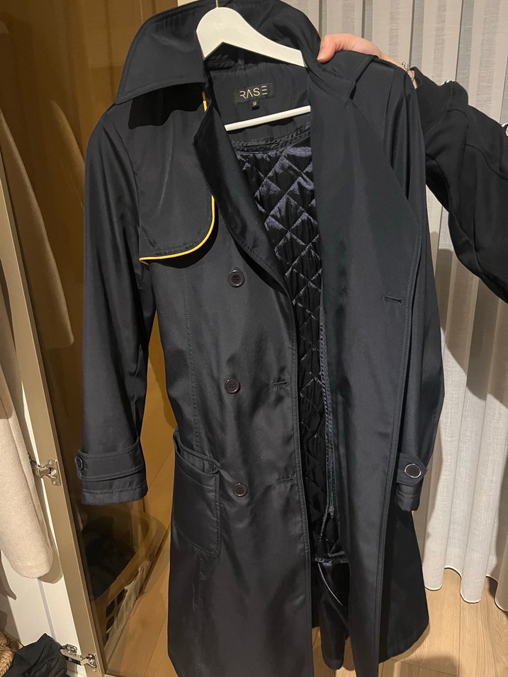 Düğmeli, siyah midi trençkot, notched yaka ve uzun kollu. RASE markalı, günlük kullanıma uygun, kumaştan yapılmıştır.