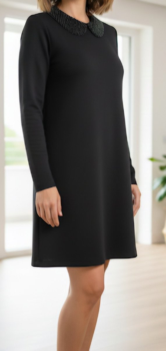 Siyah midi uzunlukta, uzun kollu ve bisiklet yaka, rahat kesimli kadın triko elbise.Tunik olarakta rahatlıkla tercih edebilirsiniz. Yumuşak sentetik kumaştan, minimalist ve çağdaş stil, ofis kullanımı için uygundur.