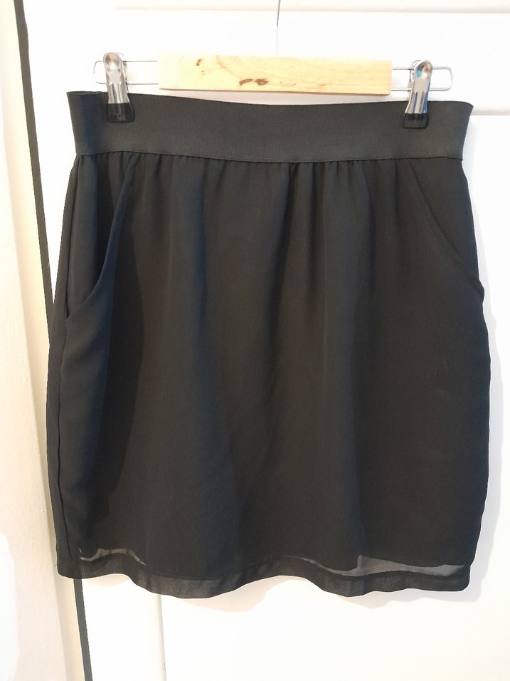 Siyah midi boy, bol kesim ve ipeksi dokulu tül, yandan cepli. Astarlı kadın etek. Minimalist, goth tarzıyla ofis kullanımı için uygundur. Desensiz, sade ve şık görünüm sunar. 38 beden, kemerde küçük bir sökülme var.