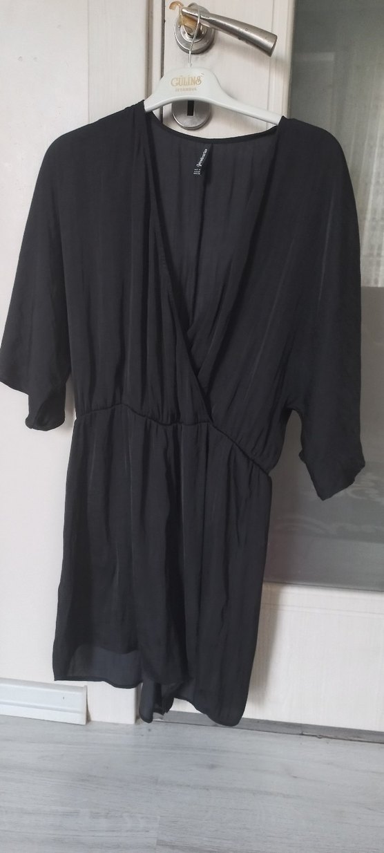 Siyah midi elbise, bol kesim ve ince askılı kollara sahip. Minimalist gotik tarzda, desen içermeyen sade bir tasarım.