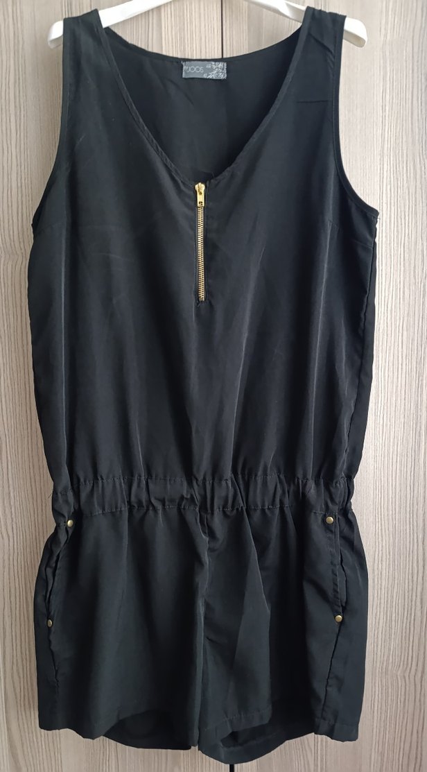 Siyah, V yakalı, fermuarlı, midi boy, kolsuz tulum. Sentetik kumaştan, bol kesim ve belde lastikli rahat tasarım. Sokak modasına uygun.