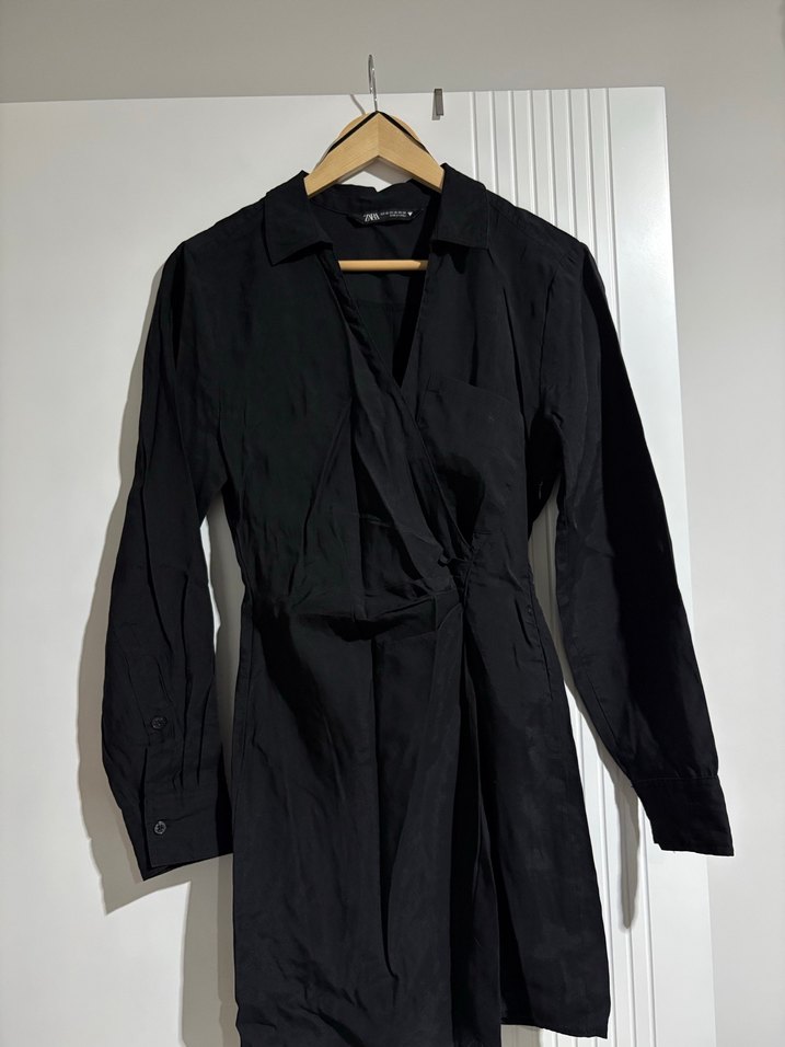 Siyah midi boy, uzun kollu, fitted kesim kadın tunik elbise, minimalist ve sokak stili ile sade bir görünüme sahiptir.