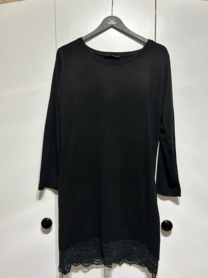 Siyah midi tunik, yuvarlak yaka ve uzun kollu, ipeksi dokulu ve bol kesim. Minimalist gotik tarzda, dantel detaylı etek ucu ile günlük kullanım için uygundur.