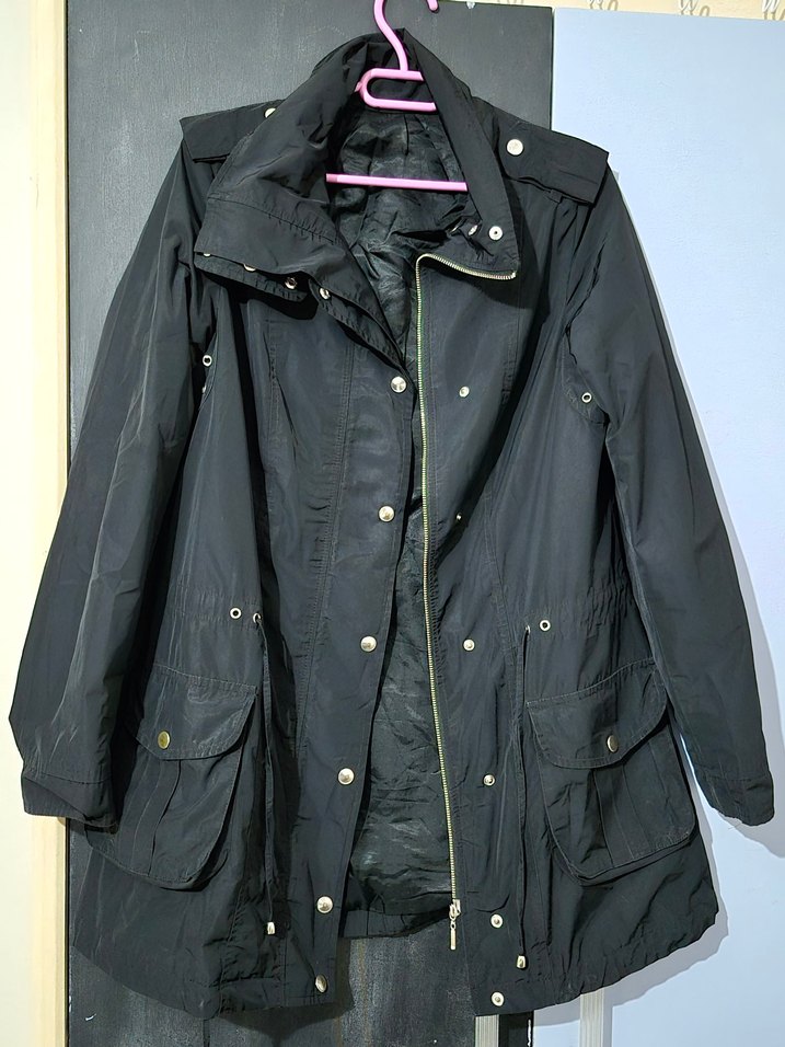 Siyah midi yağmurluk. Sokak stiline uygun, uzun kollu ve çok ceplidir. Sentetik kumaştan, dış mekan kullanımı için uygundur.