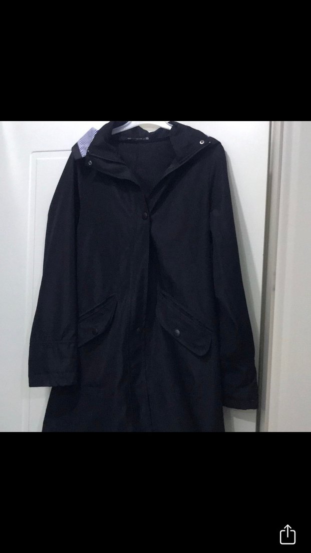 Siyah midi uzunluğunda, notlu yaka ve uzun kollu kadın yağmurluğu. Sentetik kumaştan, kemerli ve düz kesim, günlük kullanıma uygun minimal tasarım. ️sadece en alt düğmesi yoktur