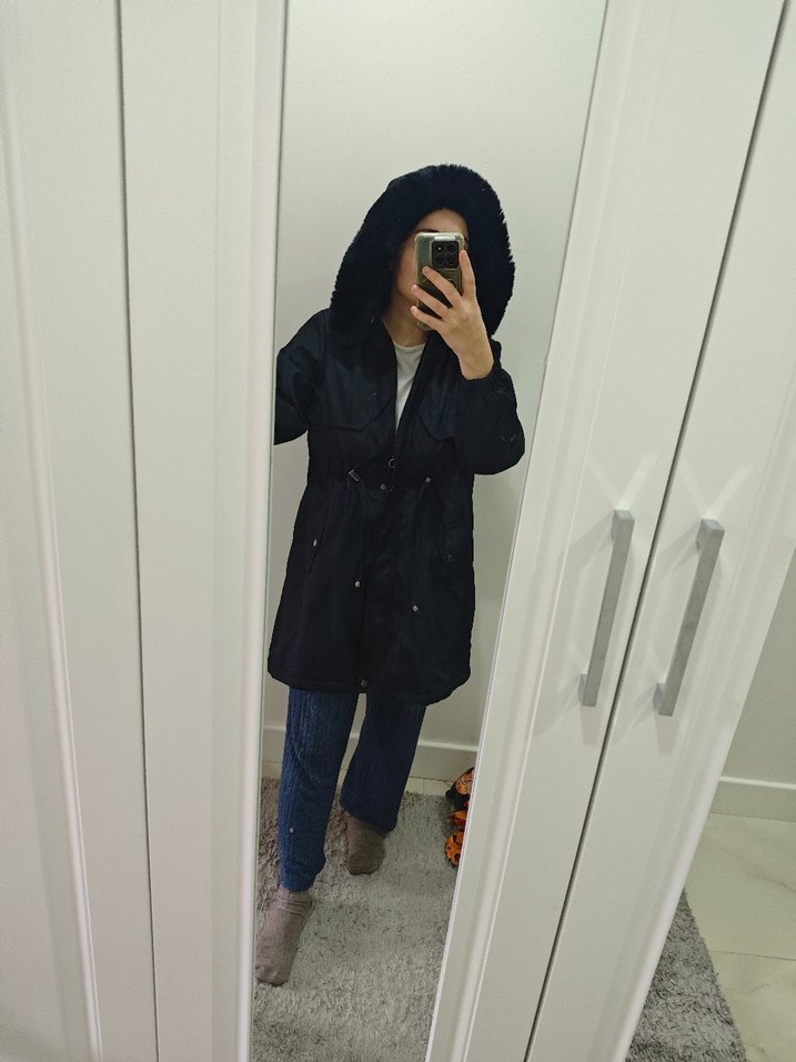 Siyah midi uzunlukta, bol kesim kadın yağmurluk. Uzun kollu, notched yakalı, yumuşak ve sıcak kumaştan yapılmıştır. Günlük kullanıma uygun, zahmetsiz şıklık sunar. ☔