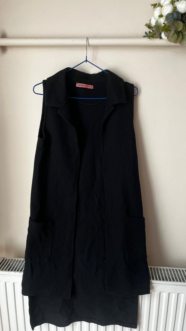 Siyah midi uzunlukta, notch yakalı, kolsuz kadın yelek. Rahat kesim ve yumuşak kumaşla günlük kullanıma uygun.