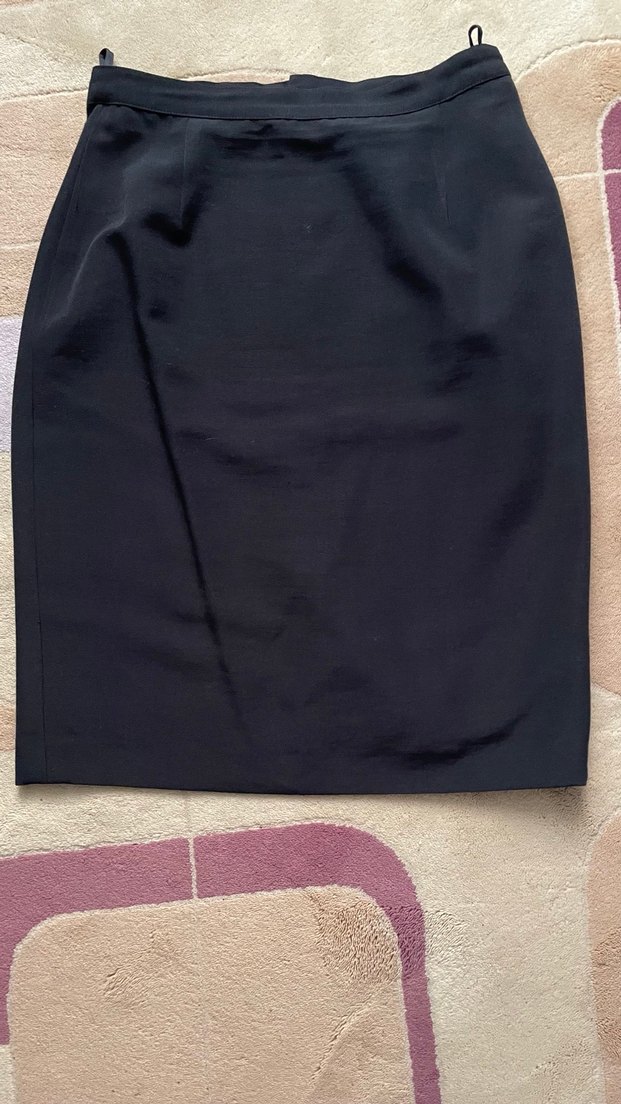 Siyah midi kalem etek, düzenli kesim ve yumuşak sentetik kumaştan, ofis için zahmetsiz şıklık sunar.