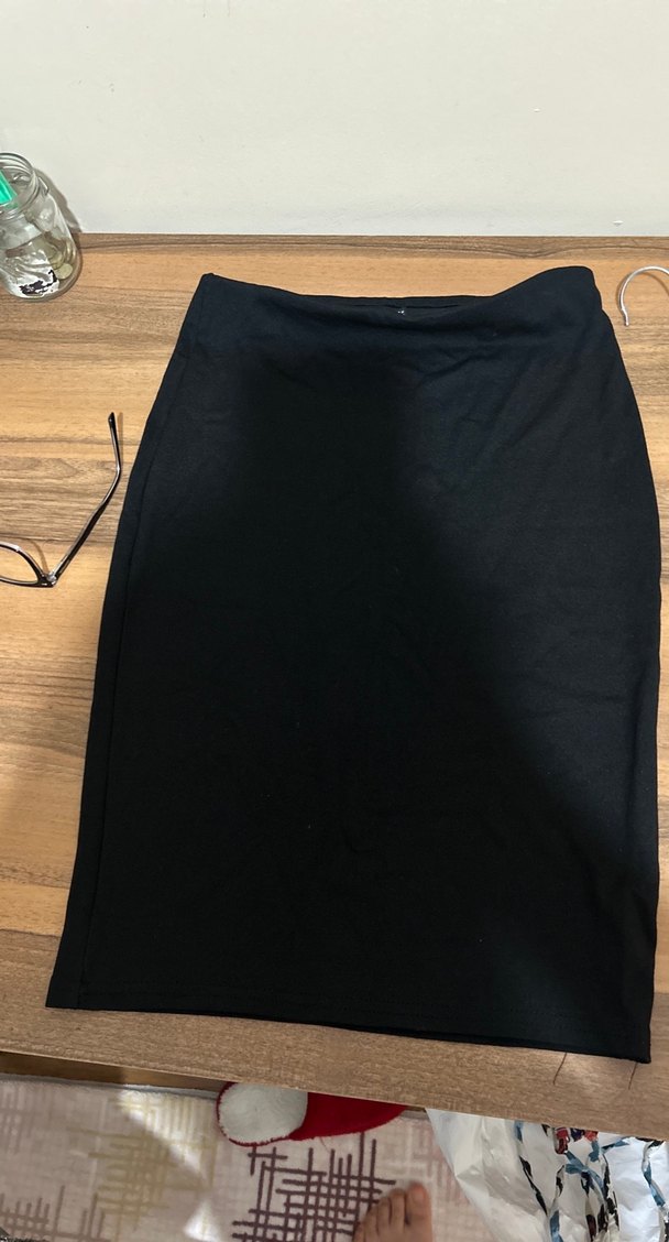 Siyah, sentetik kumaştan yapılmış, ofis ve iş ortamına uygun, sade ve şık kesim midi kalem etek.