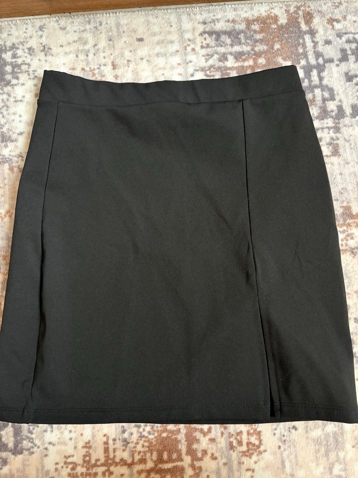 Bu siyah midi etek, vücuda oturan kesimi ve düz sentetik kumaşıyla ofis ve sokak stiline uygun sade bir tasarıma sahiptir.