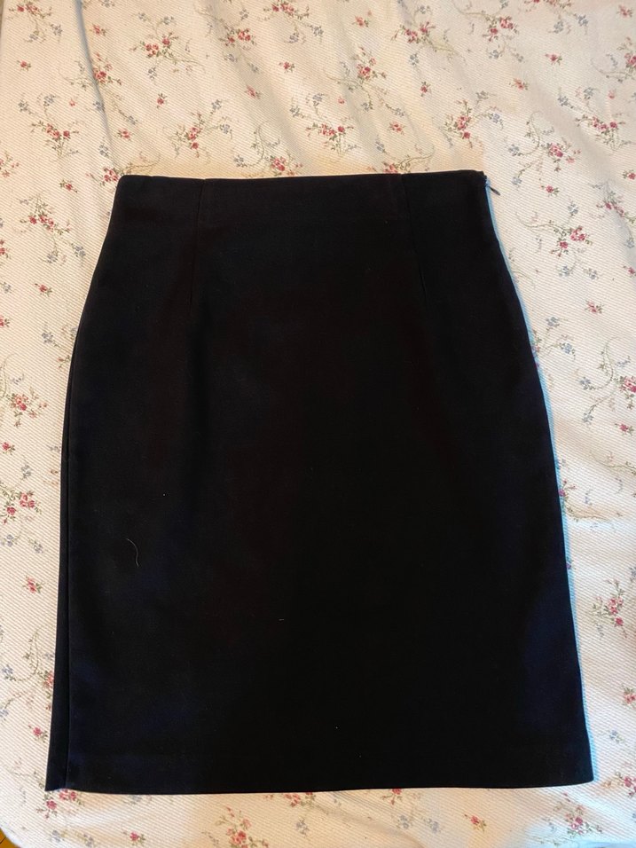 Düz siyah, midi boy, sentetik kumaştan yapılmış kalem etek, ofis için uygun, şık ve sade bir görünüme sahiptir.