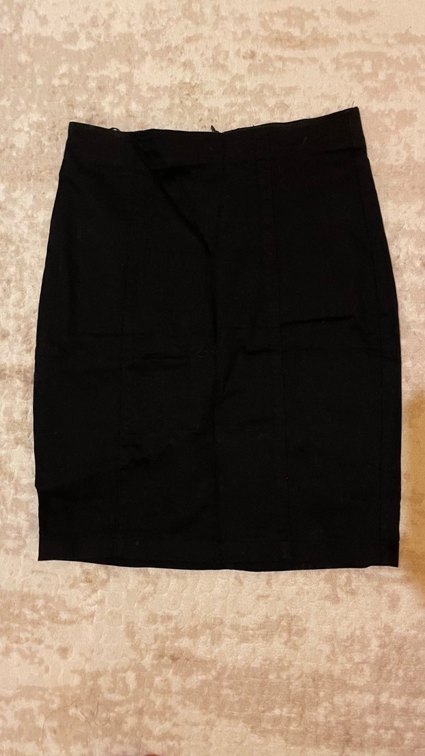Siyah midi kalem etek, alim git krep kumaş minimalist ve goth tarzını yansıtarak ofis için zahmetsiz şıklık sunar. 1 kez giyildi