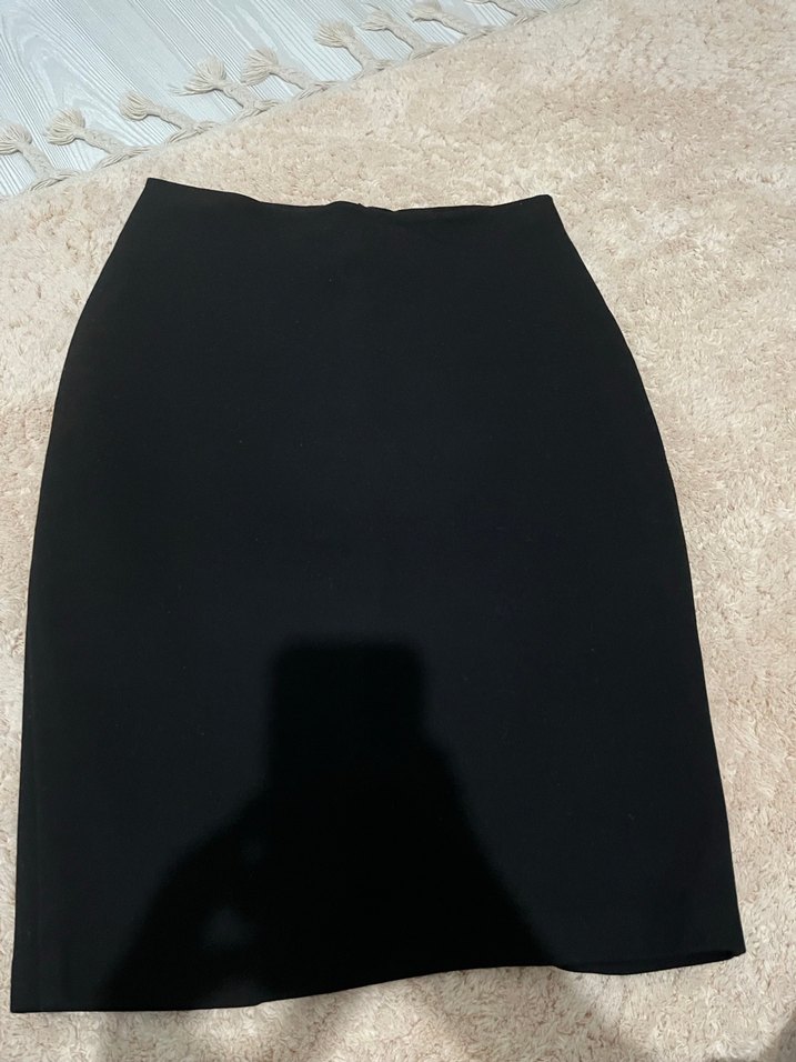Düz siyah midi kalem etek, sentetik kumaştan, ofis için sade ve şık bir görünüm sunar.