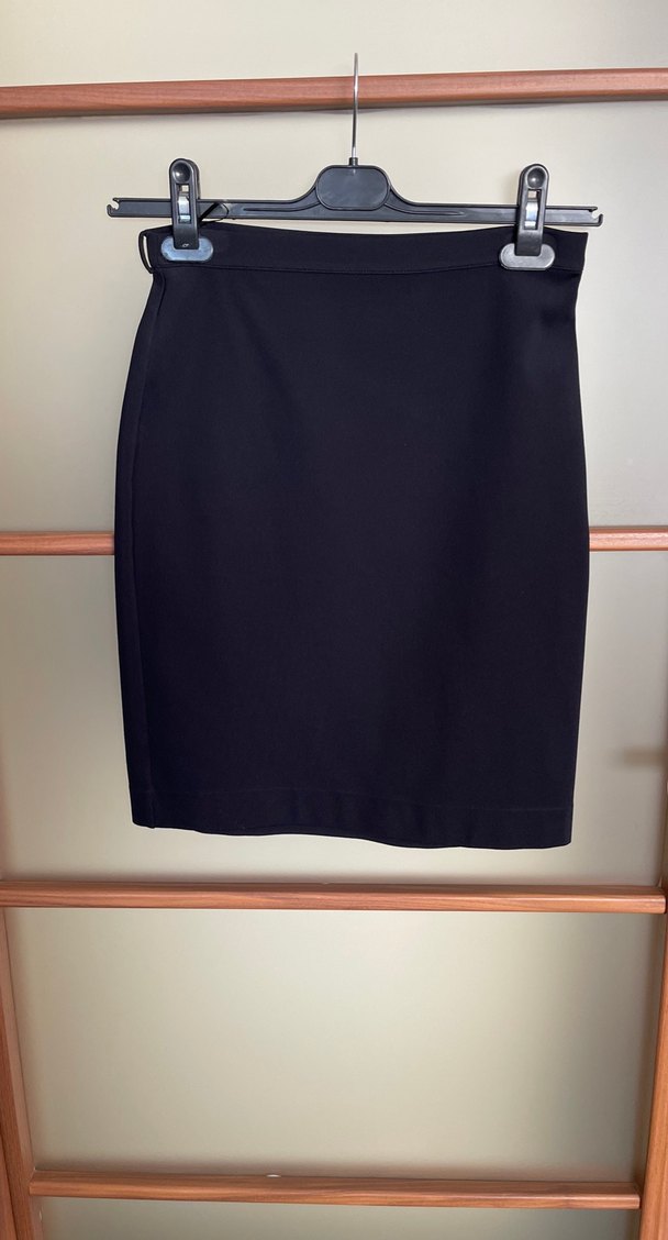 Siyah midi kalem etek, sıkı kesimi ve düz yapısıyla ofis ve günlük şıklık için uygun, sentetik kumaştan üretilmiştir. M beden ama S için daha uygun.