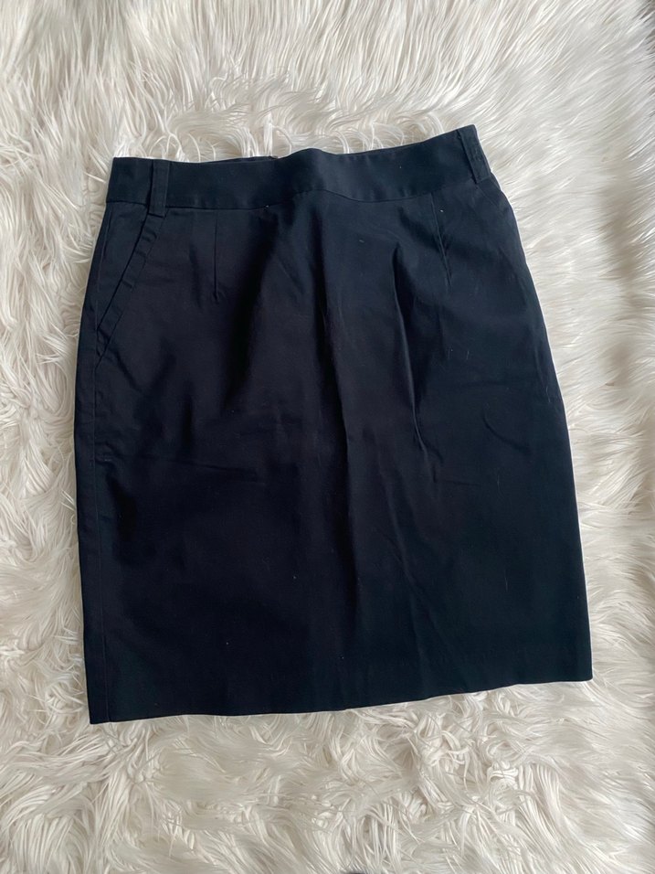 Siyah midi kalem etek, düz ve rahat kesimiyle ofis kullanımı için uygun, pürüzsüz sentetik kumaştan üretilmiştir.