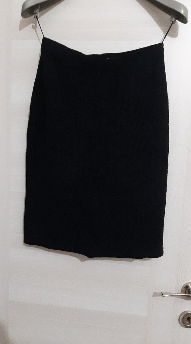 Siyah midi kalem etek, düz ve rahat kesimli, sentetik kumaştan. Minimalist ve zahmetsiz şıklık sunar, ofis için uygundur. hakim yaka ceket dpöpiyes tk bavulla durduğu için kirismis