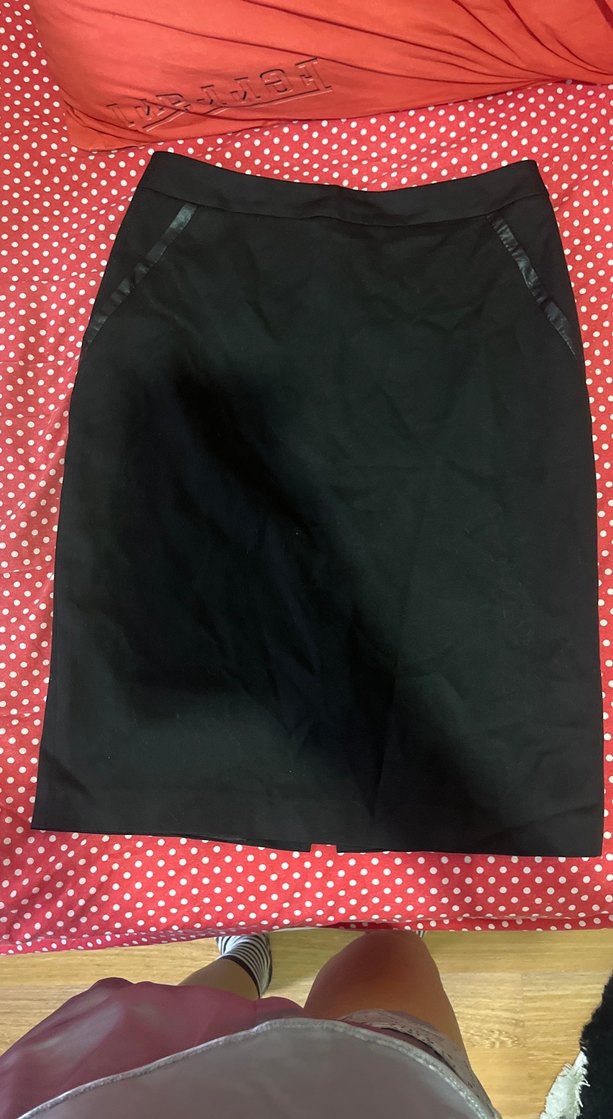Düz siyah midi kalem etek, fermuarlı ve regular fit. Pürüzsüz sentetik kumaştan, ofis ve sokak stiline uygun.