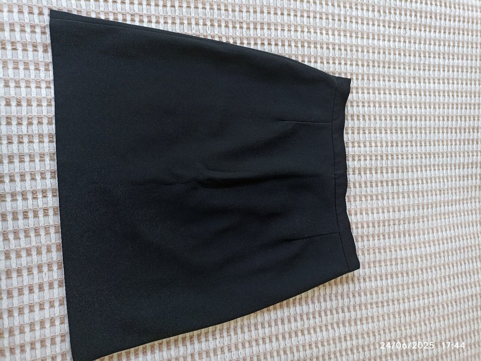 Siyah midi uzunlukta, fermuarlı, düz kalem etek. Sentetik kumaştan, normal kesimdir ve iş ortamı için uygundur.