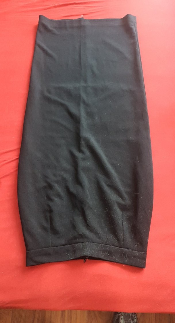 Fermuarlı detaylı, siyah midi kalem etek, yumuşak sentetik kumaştan, minimalist goth ofis tarzına uygun.