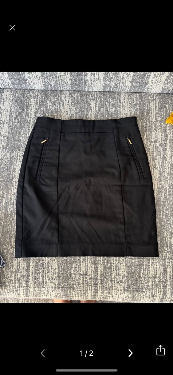 Siyah midi kalem etek, fermuarlı ceplere sahiptir ve sentetik kumaştan üretilmiştir. Ofis ve günlük sokak stili için uygundur.