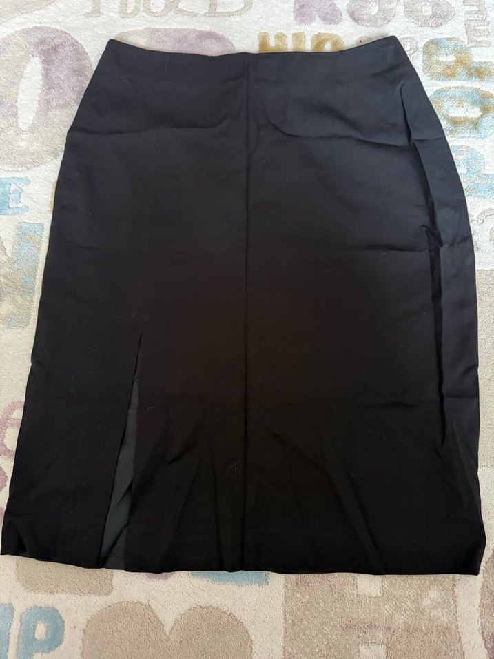 Sentetik kumaştan, yırtmaçlı siyah midi kalem etek. Düzenli kesim, iş ve gotik tarzlar için uygundur.