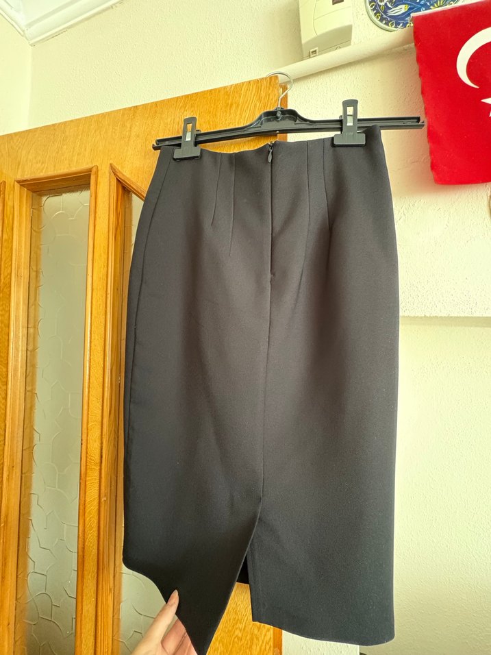 Siyah midi kalem etek, yırtmaçlı ve vücuda oturan kesimde, pürüzsüz sentetik kumaştan, ofis ortamı için uygun.