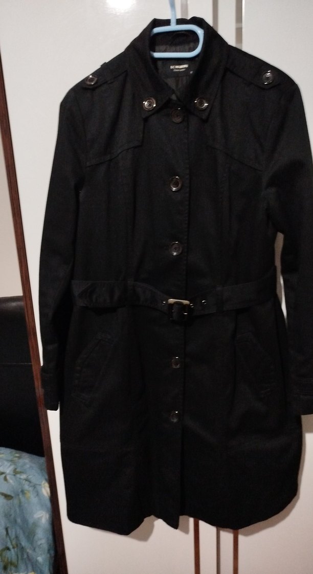 Siyah midi uzunlukta, kemerli, uzun kollu ve klasik goth tarzında kadın trençkottur. Sentetik kumaştan üretilmiş, ofis kullanımı için uygundur.