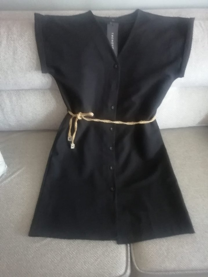 Düz siyah midi elbise, V yakalı ve düğmeli ön tasarıma sahip. Kemer detaylı, rahat kesim ve sentetik dokulu kumaştan günlük kullanıma uygun.