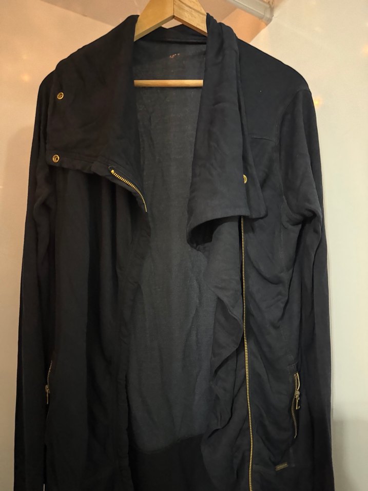 Bu siyah midi uzunlukta keten ceket, yakasında çıtçıtlı ve fermuarlı detaylara sahiptir. Bol kesim ve uzun kolludur, günlük rahat kullanıma uygundur. Minimalist tarzıyla sokak modasına uyum sağlar.